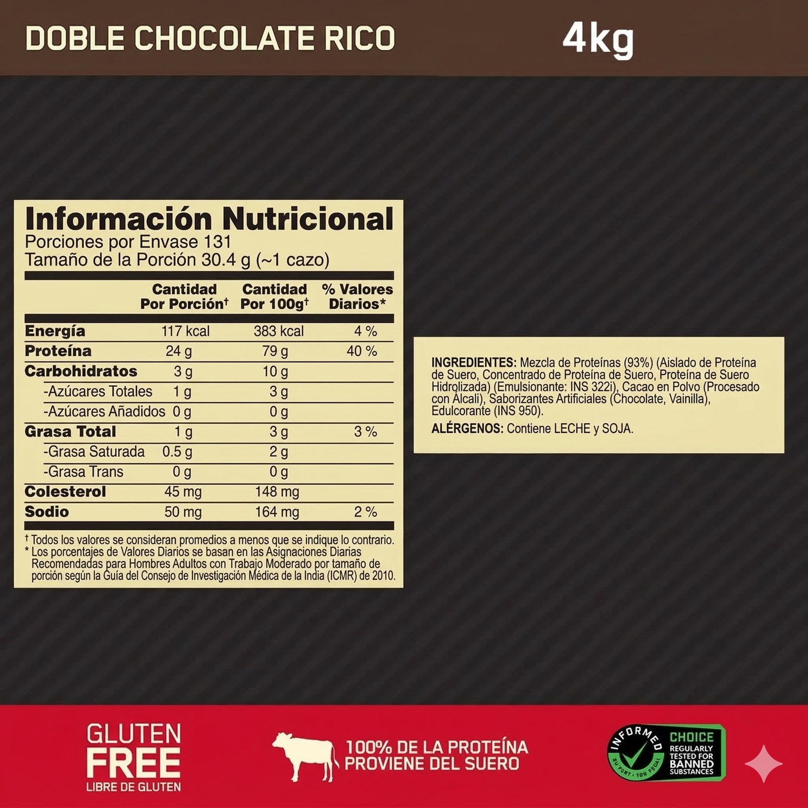 Lista de Ingredientes: Mezcla de proteínas (Aislado de proteína de suero, Concentrado de proteína de suero, Péptidos de suero), Cocoa (procesada con álcali), Lecitina de soya y/o girasol (emulsionante), Sabores naturales y artificiales, Acesulfame K (edulcorante).