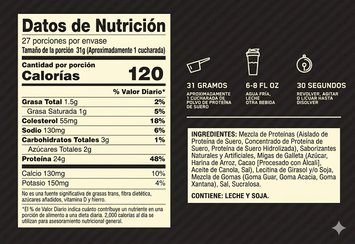 • Lista de Ingredientes: Mezcla de proteínas (Aislado de proteína de suero de leche, Concentrado de proteína de suero de leche, Péptidos de suero), Lecitina de soya (emulsionante), Saborizantes naturales y artificiales, Mezcla de enzimas (Aminogen®, Lactasa), Sal, Sucralosa (edulcorante), Acesulfame K (edulcorante) y Colorantes artificiales (varían según el sabor).
