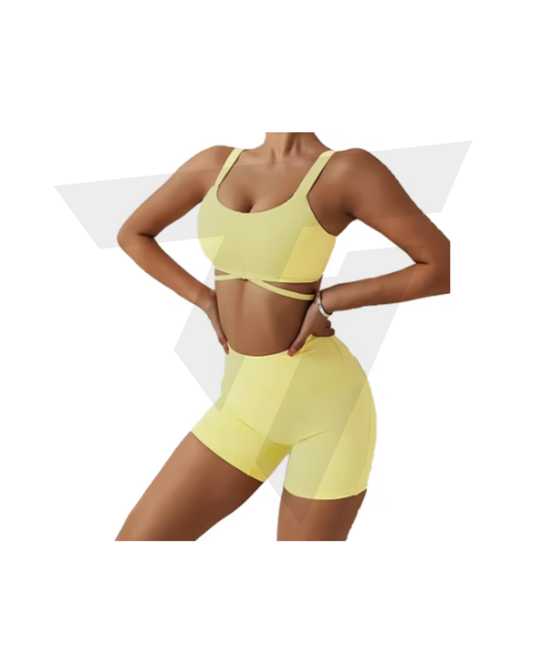 El conjunto deportivo con diseño moderno y cómodo. Consiste en un top deportivo sin mangas con tirantes finos y un detalle cruzado en la parte frontal, que brinda soporte y estilo. El short es de corte corto, ajustado y de tiro alto, lo que lo hace perfecto para actividades físicas que requieren libertad de movimiento asegurando comodidad y transpirabilidad durante el ejercicio. Es una opción fresca y vibrante para quienes buscan un conjunto deportivo funcional y con un toque de estilo.
