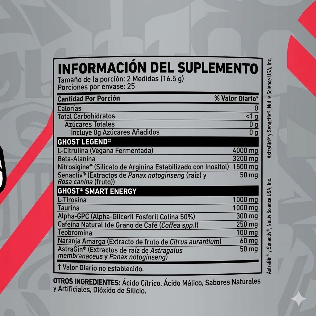 Lista de Ingredientes: L-Citrulina (Vegana), Beta-Alanina, Silicato de Arginina Estabilizado con Inositol (Nitrosigine®), Taurina, Cafeína anhidra, Alfa-Glicerofosforilcolina (AlphaSize®), Extracto de Panax notoginseng y Rosa roxburghii (Senactiv®), Extracto de Theobroma cacao, Saborizantes naturales y artificiales, Ácido Cítrico, Ácido Málico, Dióxido de Silicio (antiaglomerante), Silicato de Calcio (antiaglomerante), Sucralosa (edulcorante), Acesulfame K (edulcorante) y Colorantes artificiales (varían según el sabor).