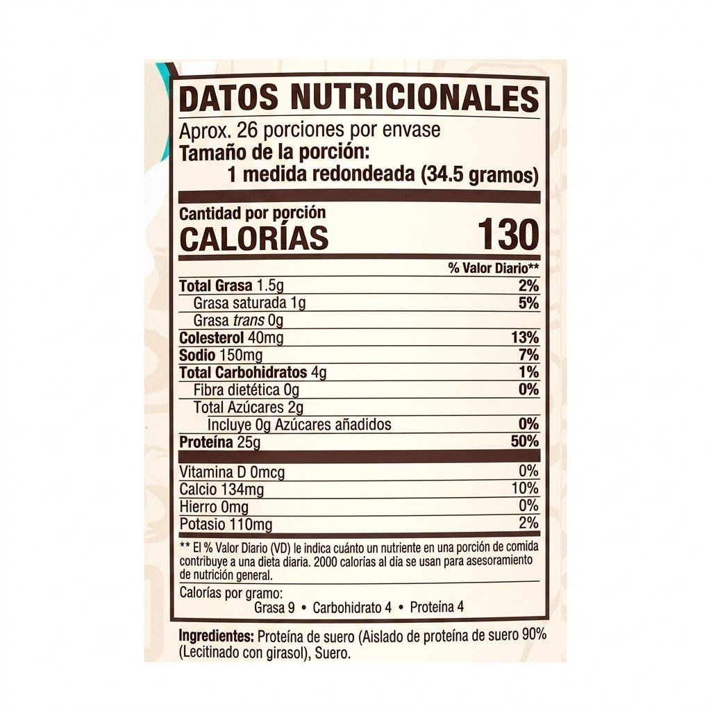 Lista de Ingredientes: Mezcla de proteínas (Aislado de proteína de suero 90%, Concentrado de proteína de suero 80%, Aislado de proteína de suero hidrolizado), Saborizantes naturales y artificiales, Sal, Mezcla de enzimas digestivas (Proteasas, Bromelina, Lactasa), Gomas (Celulosa, Xantana) y Sucralosa (edulcorante).