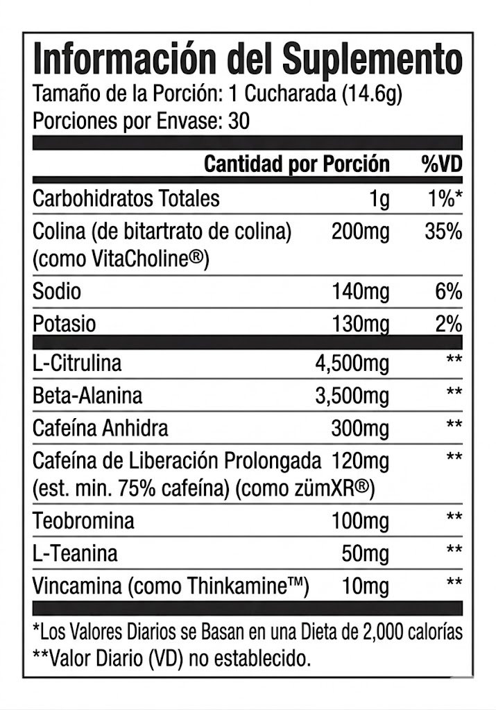 Lista de Ingredientes: L-Citrulina, Beta-Alanina, Cafeína anhidra, Bitartrato de Colina, Teobromina, Citicolina (Cognizin®), Extracto de Vinca minor (Thinkamine™), Saborizantes naturales y artificiales, Ácido Cítrico, Ácido Málico, Dióxido de Silicio (antiaglomerante), Silicato de Calcio (antiaglomerante), Sucralosa (edulcorante), Acesulfame K (edulcorante) y Colorantes artificiales (varían según el sabor).